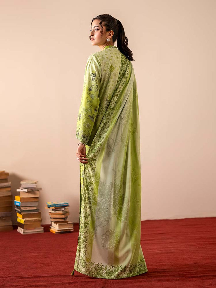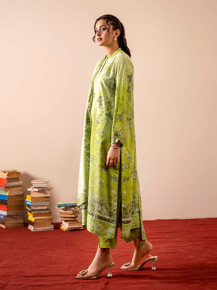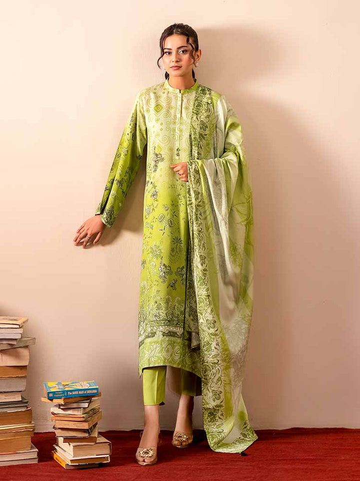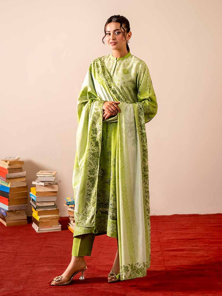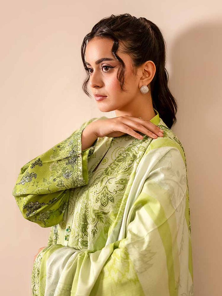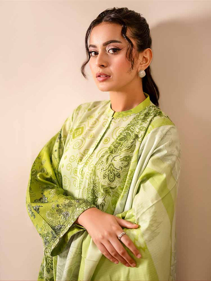 Sing a song of style and sophistication with the GEET 3-Piece Unstitched Digital Printed Linen Suit. This exquisite ensemble is a perfect blend of texture, print, and elegance, designed for the modern woman who appreciates detail. The shirt is crafted from vibrant Digital Printed Fancy Linen, creating a bold and beautiful statement, while the contrasting dyed linen trousers and a stunning Bana Dora linen dupatta complete this harmonious set.