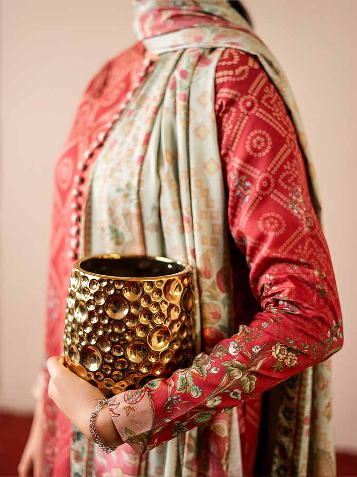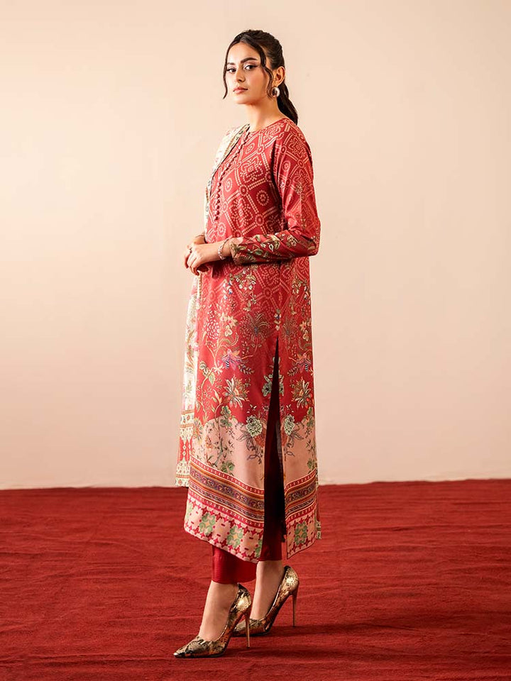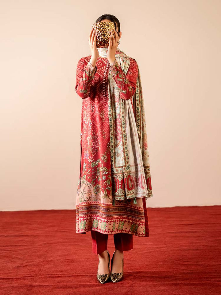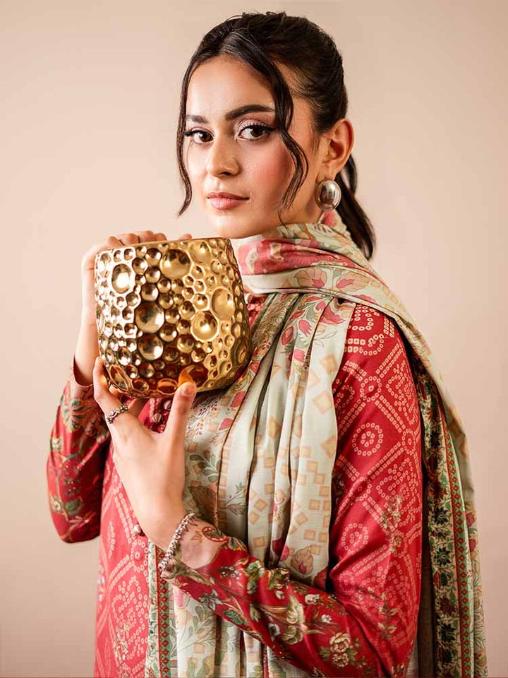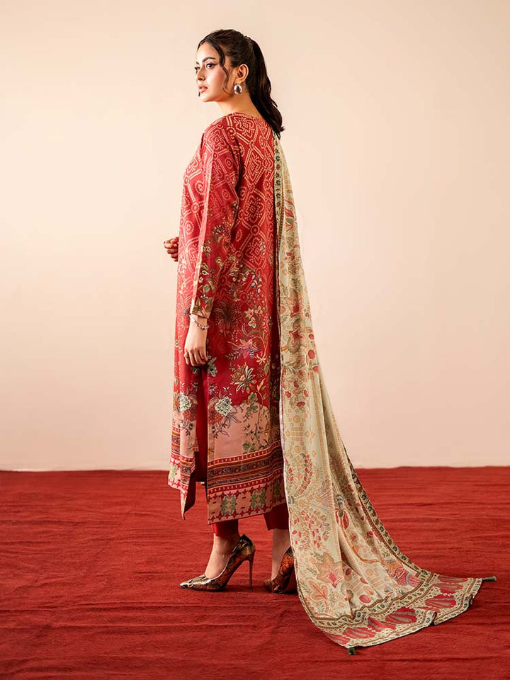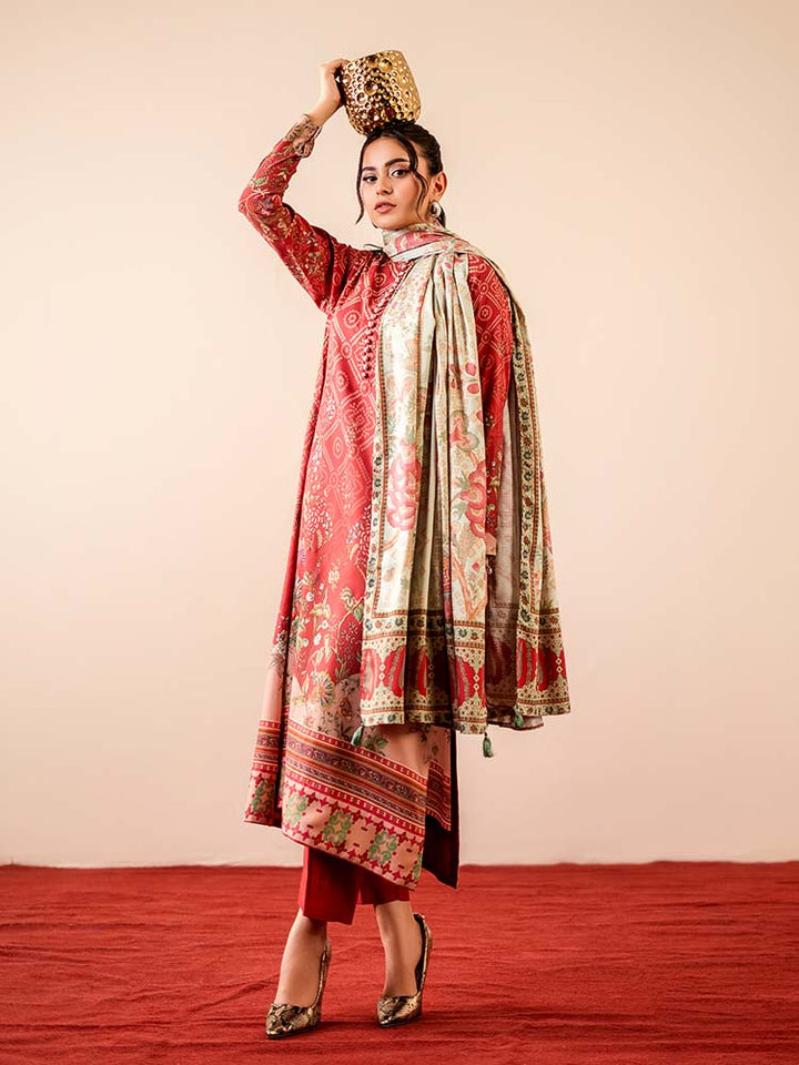 Sing a song of style and sophistication with the GEET 3-Piece Unstitched Digital Printed Linen Suit. This exquisite ensemble is a perfect blend of texture, print, and elegance, designed for the modern woman who appreciates detail. The shirt is crafted from vibrant Digital Printed Fancy Linen, creating a bold and beautiful statement, while the contrasting dyed linen trousers and a stunning Bana Dora linen dupatta complete this harmonious set.
