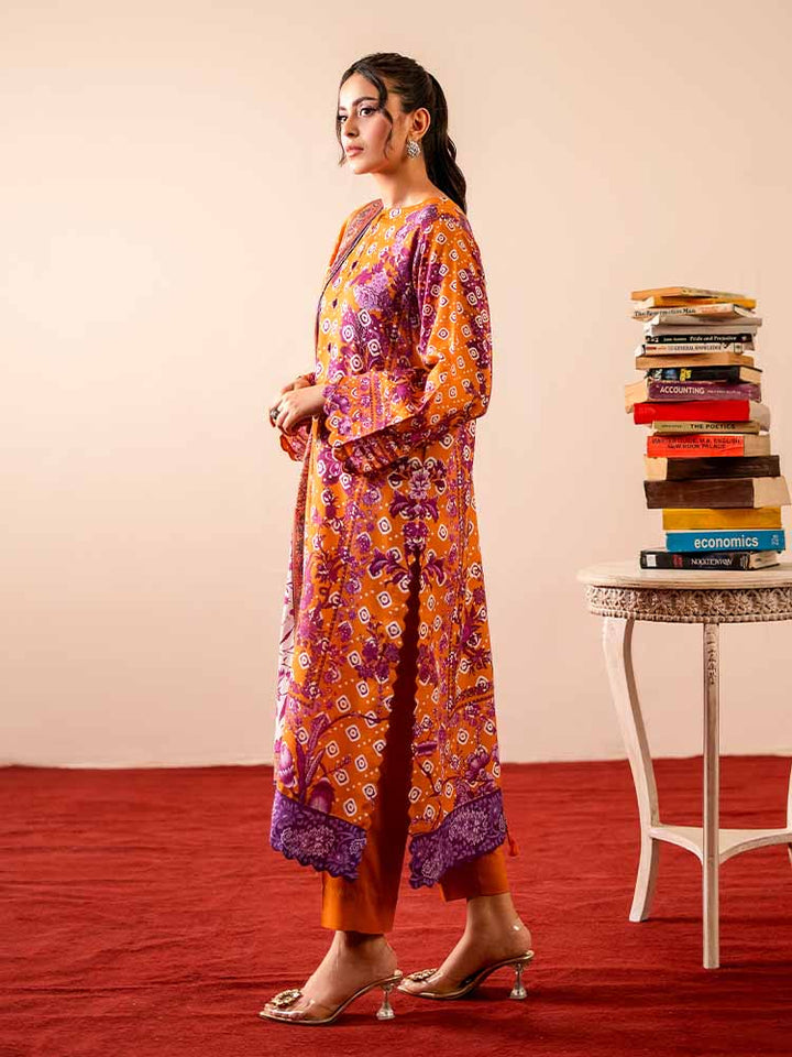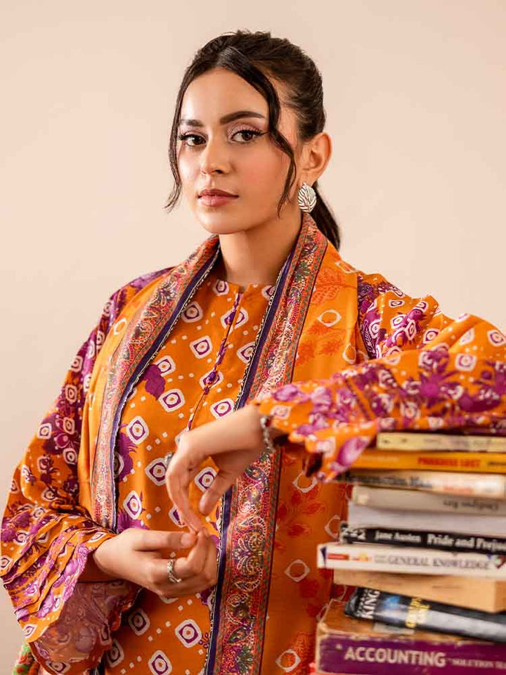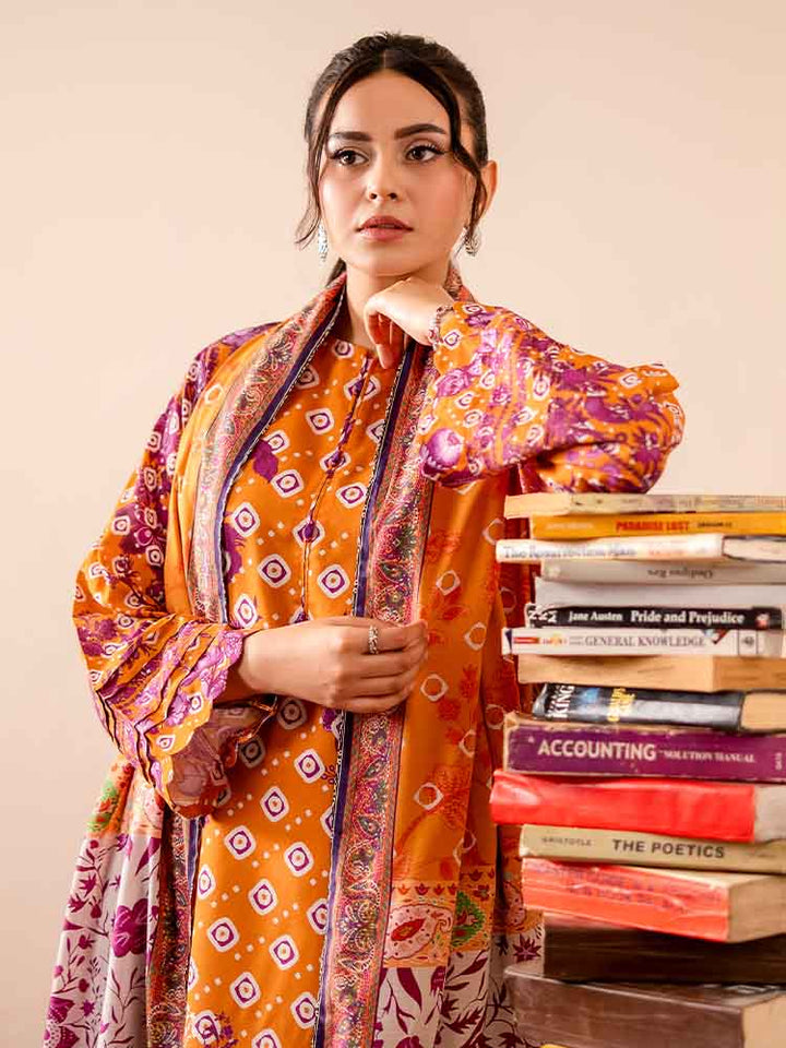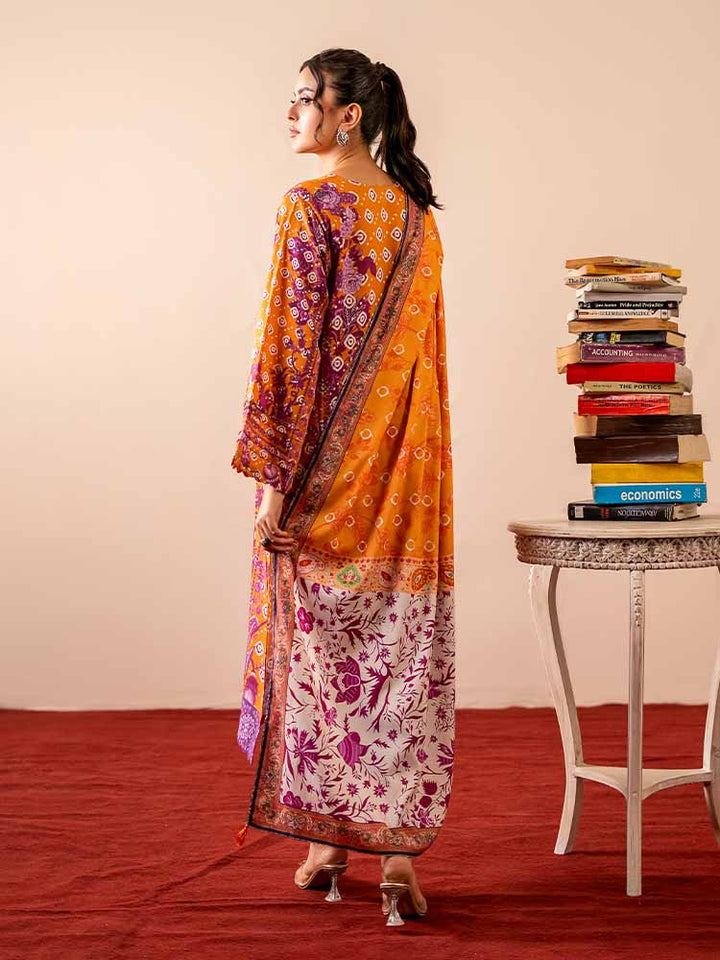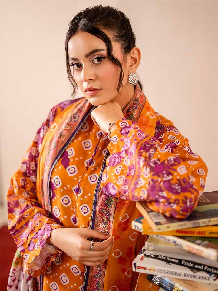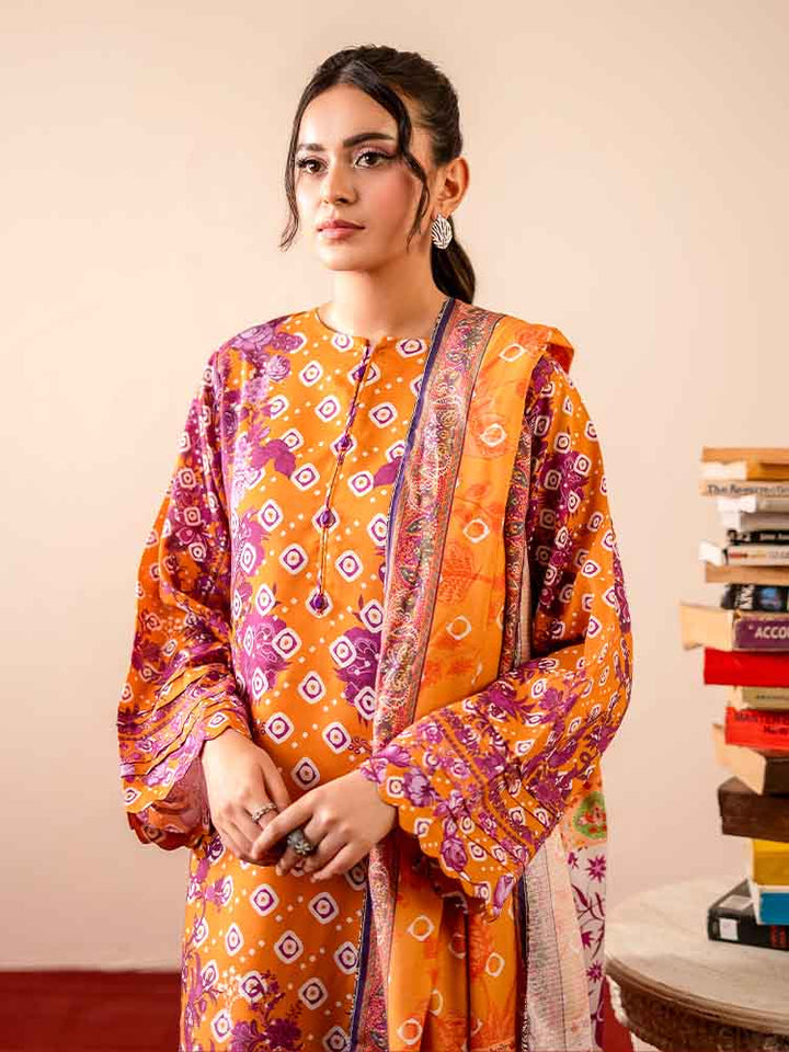 Sing a song of style and sophistication with the GEET 3-Piece Unstitched Digital Printed Linen Suit. This exquisite ensemble is a perfect blend of texture, print, and elegance, designed for the modern woman who appreciates detail. The shirt is crafted from vibrant Digital Printed Fancy Linen, creating a bold and beautiful statement, while the contrasting dyed linen trousers and a stunning Bana Dora linen dupatta complete this harmonious set.
